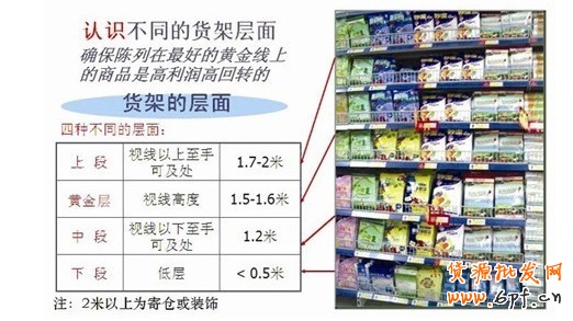 商品陳列 架的高度一般以90至180厘米最為普遍,而顧客胸部至眼睛的高度是最佳陳列處,有人稱(chēng)此為“黃金空間”。