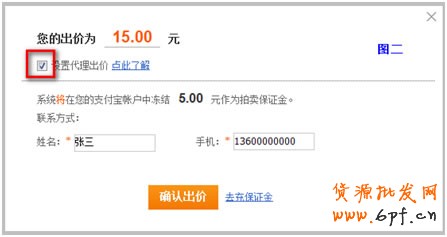 舉例:某拍品的起拍價為1元,加價幅度為6元,買家A設置的代理出價價格為15元(如圖一的競拍價格),并在彈出的新窗口頁面勾選"設置代理出價"(如圖二),則此次A的出價金額為1元并設置代理出價成功,拍品當前價格為1元。