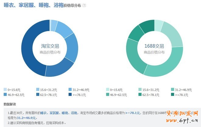 1.最近30天,所有面料的睡衣丶家居服丶睡袍丶浴袍,淘寶市場成交最多的商品價格帶為>=78.1元,您的同行在1688市場采購最多的商品價格帶為31.2~46.9元。