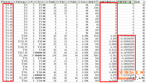 然后用之前的①②公式,將關鍵詞進行排序,篩選出優質度高,點擊扣費接近關鍵詞最高點擊出價的詞。為什么這么說呢,優質度高那么說競爭小,接近關鍵詞最高出價說明有利于我們優化。