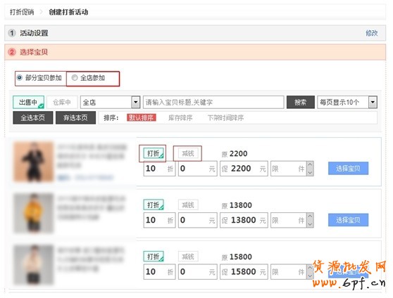 接下來是選擇部分寶貝 打折或者整店,選擇后可以設置折扣,或者拍下減多少錢。