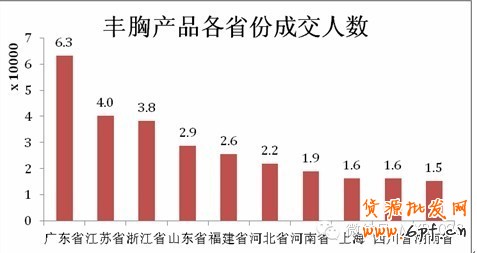 最愛豐胸省份當數廣東,在一個月的時間里,廣東就有6.3萬人購買了豐胸產品,江蘇和浙江也分別有4萬和3.8萬余人購買。在購買豐胸產品排行前十的省份中,江蘇、山東、河北、河南的排行明顯上升,湖南則進入了top10榜單。