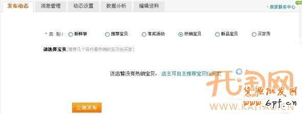 這里的店鋪動態,顯示的是我們收藏過的店鋪的動態, 比如說你店鋪里面的收藏用戶,在你發布店鋪動態后,就能在這里看到你的店鋪動態了。好友動態,則是我們的粉絲可見的,就像微博粉絲一樣,二者不沖突。在管理店鋪動態里面可以發布店鋪動態,如下:
