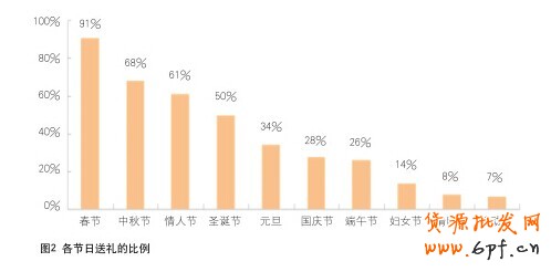 具體到逢年過節,春節、中秋節、情人節、圣誕節送禮的比例都超過50%,是中國送禮的四大節日。其中春節送禮比例最高,達到91%;中秋節緊隨其后,達到68%。對于企業來說,開發針對這四個節日的定制禮品或禮品裝具有較大的市場機會。