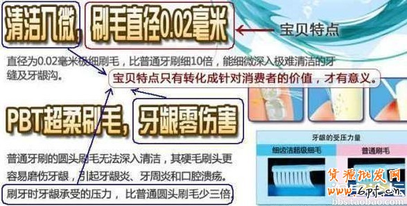 在這個寶貝描述中,刷毛直徑0.02mm是產品特點,而牙齦零傷害就是對價值的提煉了。