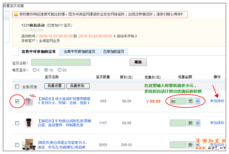 在商品圖片前的勾選框中打鉤,然后在優(yōu)惠金額中,填入你要打幾折,當(dāng)你輸入折扣后,系統(tǒng)會(huì)自動(dòng)計(jì)算出優(yōu)惠后的價(jià)格,然后再點(diǎn)擊“參加活動(dòng)”即可。