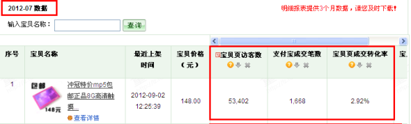 通過上面的數據我們可以看出,該店鋪目前主推3款MP4,寶貝1的各項數據都相對優秀,具有很好的發展潛力。于是我們選取該寶貝作為主推寶貝,制定優化思路。(此處略)