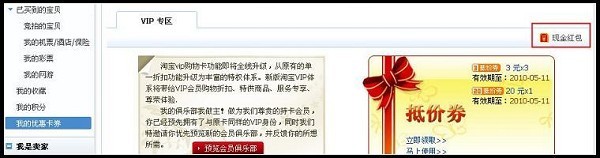 您也可以進(jìn)入“我的淘寶”—“我是買家”—“我的優(yōu)惠卡券”頁面點(diǎn)擊VIP卡專區(qū)右上角的“現(xiàn)金紅包”進(jìn)入支付寶紅包管理平臺查看(如圖):