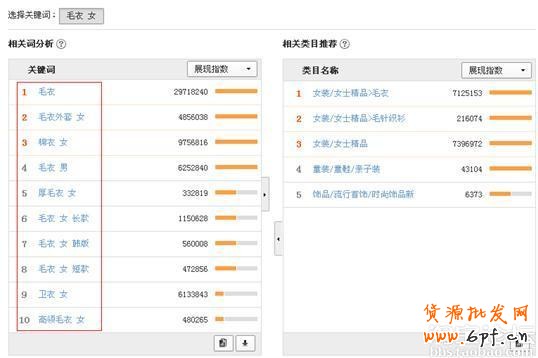 流量解析功能添加關(guān)鍵詞,流量解析,搜索相關(guān)關(guān)鍵詞,相關(guān)詞分析里面有各個擴展關(guān)鍵詞的展現(xiàn)指數(shù),點擊、轉(zhuǎn)化分析,這些詞都是淘寶推薦的搜索量比較大的詞;在相關(guān)類目推薦里面這里說明了您搜索關(guān)鍵詞的主搜索類目和輔搜索類目下的不同展現(xiàn),這里有助于我們優(yōu)化關(guān)鍵詞類目相關(guān)性這一點,提升關(guān)鍵詞質(zhì)量得分。