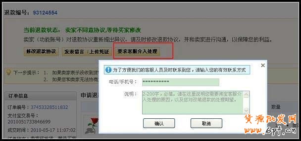當(dāng)然要是真的到了無法調(diào)和的地步,還是很有必要申請?zhí)詫毧头槿氲模敲慈绾紊暾執(zhí)詫毧头槿肽兀M(jìn)行中的退款,若雙方協(xié)商后不能達(dá)成一致或未得到解決,在規(guī)定時(shí)間后進(jìn)入退款詳情頁面,任意一方可以點(diǎn)擊“要求客服介入處理”,填寫您的有效聯(lián)系方式,說明原由,點(diǎn)擊“確認(rèn)”申請?zhí)詫毧头槿雲(yún)f(xié)調(diào)處理。操作如下圖: