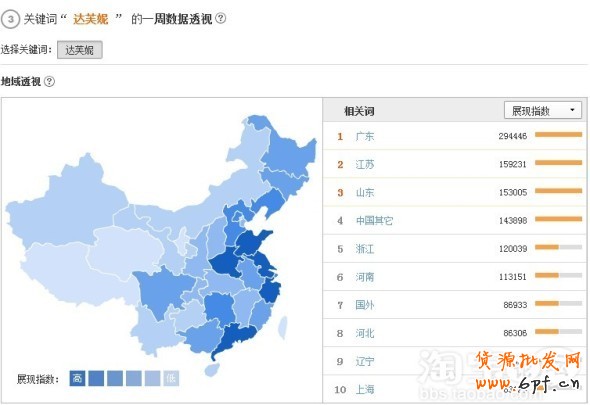 熱銷地區(qū)可以根據(jù)寶貝前一段時(shí)間的累計(jì)選擇,例如量子橫道寶貝被訪排行寶貝被訪詳情 可以看到這個(gè)寶貝最近訪客比較多省份。