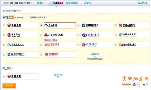 1、登錄支付寶賬戶,找到需要付款的交易(該筆交易支持信用卡支付),點擊【付款】;在【信用卡】頁面下,點擊“快捷支付(含卡通)”的【交通銀行】—【下一步】;