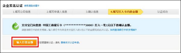 8、營業(yè)執(zhí)照審核通過,需要在3個(gè)工作日等待打款,打款成功之后,登錄到支付寶賬戶,點(diǎn)擊【申請(qǐng)認(rèn)證】——點(diǎn)擊【輸入打款金額】;