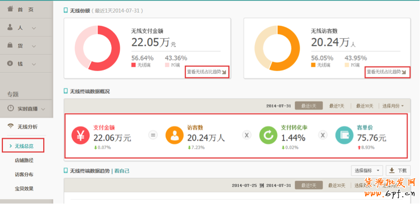1、無線端對店鋪整體的貢獻度——【生意參謀】<<無線分析<<無線總覽提供店鋪無線的訪客數(shù)、支付金額及占比趨勢,并提供看自己趨勢圖、看同行平均&同行優(yōu)秀對比趨勢,讓您了解店鋪無線的一個整體概況)