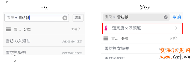 解讀:只有用行業詞或類目詞搜索時才會出現,如:男裝、連衣裙等。可以起到給目的性不強的閑逛買家一個導購的作用。淘寶類目的流量會增加。值得一提的是,頻道頁面的兩個特色導購欄目里全都是天貓寶貝,而且女裝類目寶貝圖片全部調用8001200的長方形圖。