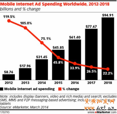 2014年移動(dòng)廣告方面的投入預(yù)計(jì)將會(huì)增長75%,達(dá)到314.5億美元,這將占全球數(shù)字營銷投入總額的1/4。谷歌和Facebook這樣的企業(yè)對(duì)于這個(gè)趨勢有很強(qiáng)的推動(dòng)作用。