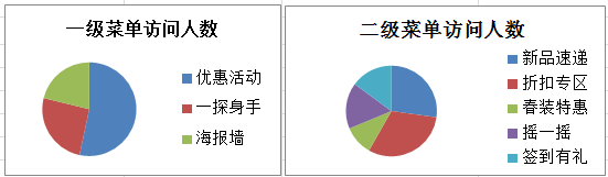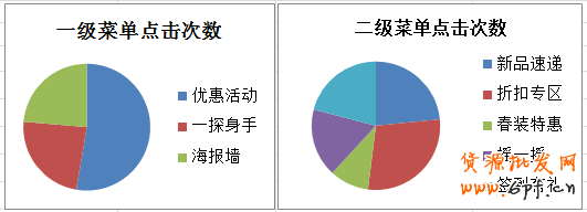 從菜單的訪問次數(shù)和訪問人數(shù)來看,訪問熱度最大的一級菜單是“優(yōu)惠活動”。用戶點擊次數(shù)、訪問人數(shù)排名,優(yōu)惠活動關(guān)注度明顯最高,是其余兩項活動總和,其余兩項有待優(yōu)化。而在“優(yōu)惠活動”的二級菜單中,折扣>新品>春裝,符合手機用戶群體特點,手機支付訂單偏向于價格優(yōu)惠的商品,客戶瀏覽偏向于獲得優(yōu)惠信息而不是新品(此處與客戶群體有關(guān)),另現(xiàn)階段手機用戶對于春裝的需求不高。