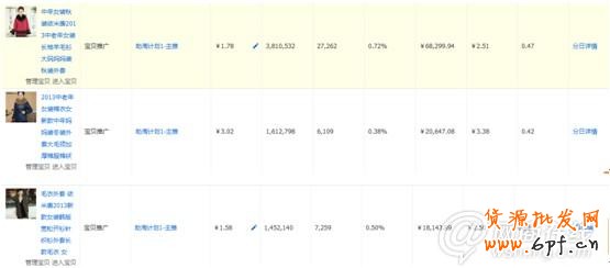 3)我們抓取花費(fèi)前三的寶貝,整體分析,第一和第三款寶貝在當(dāng)前的季節(jié)來(lái)說(shuō),不是很應(yīng)季,花費(fèi)也比較多,那么我們果斷的暫停掉這兩款寶貝。對(duì)于棉衣來(lái)說(shuō),雖然當(dāng)時(shí)的一個(gè)投入產(chǎn)出比不是很高,但是比較應(yīng)季,點(diǎn)擊率有進(jìn)一步提升的一個(gè)空間。