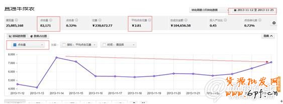 前面我們經(jīng)過(guò)寶貝調(diào)整,選擇留下了這款棉衣。于此同時(shí)我們借助雙12這個(gè)東風(fēng),結(jié)果如上圖呈現(xiàn),寶貝的點(diǎn)擊率在我們的優(yōu)化下由0.38%上升到0.59%,寶貝的一個(gè)投入產(chǎn)出比特有了一個(gè)很大的提升。