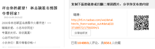 令商家可喜的是,雙11大促當天,林志穎發了一條微博,為微淘許愿街做宣傳,并提供羅蒙官方旗艦店微淘的鏈接,直接將林志穎的粉絲引入羅蒙官方旗艦店的微淘,為店鋪吸引了大量粉絲,把消費者對林志穎的吸引力轉化為對林志穎定制款寶貝的消費引導上,從而加大寶貝的曝光率以及轉化率。