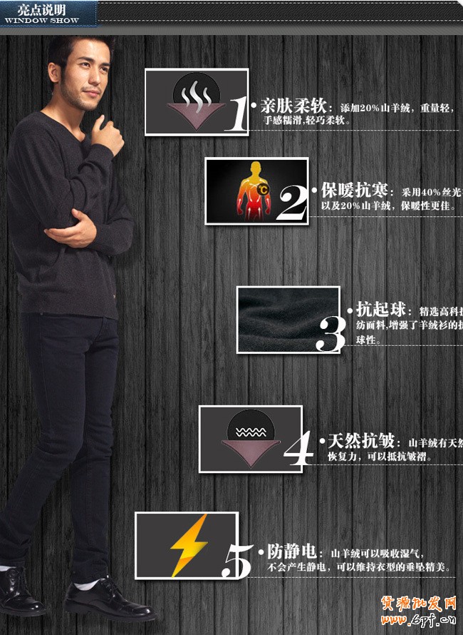 這個是我做的寶貝圖片,我做的是男裝,男性通常比女性更注重材質的舒適性,而女性更注重款式的時尚性。所以我從面料的特性出發,考慮到用戶到了冬天皮膚干燥,會起靜電,所以“親膚”就會產生共鳴。把自己當買家,想想你買這個衣服的時候最在意什么就把什么放在最起眼的地方。