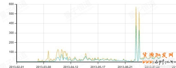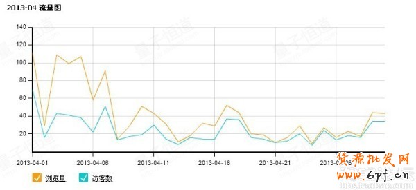 大家請看2013-03流量圖,我的店是2月28號注冊的店,后面然后上傳了一款寶貝,只是一款,大家注意到流量了沒,大約是在100左右,而且是很高的位置,當然出現峰值的時候是7天的一個上下架時間,那個時候流量最高。