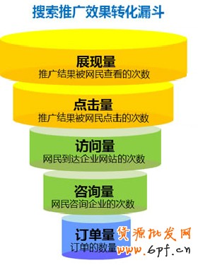 這個是搜索引擎推廣的漏斗圖,做上面是展現量,最低端是訂單量。我們的目的就是要訂單量。但是,實現這個目的需要做好每一個中間環節。他們是:點擊量,訪問量,咨詢量。做不好網絡營銷的大部分原因往往就是這三個環節。今天,我們就把他分析清楚。