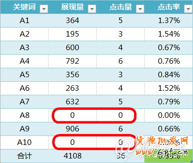 從上圖我們可以看到,A8和A10無效的展現是非常多的,按照上面的方法,我們把這兩個詞直接刪除,于是有了下面的結果