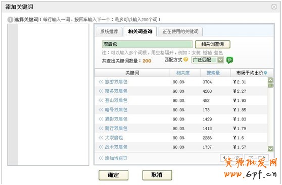 另外,還可以運用關鍵詞推薦工具,這個工具可以根據寶貝的特點提供適合寶貝的競價詞,同時也可以提供相關度、搜索量、市場平均出價的篩選,提供正在使用的競價詞分析。看下圖可以得知,旅游雙肩包是市場平均出價最高的詞,但相比之下,搜索量卻不是這段時期內最高的,所以賣家在找關鍵詞時,應結合相關度、搜索量和平均出價綜合考慮,比如“大雙肩包”就是一個不錯的推廣詞。