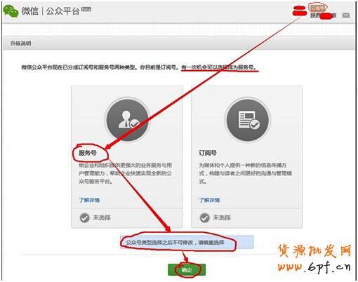 3、進(jìn)入升級(jí)服務(wù)號(hào)的頁(yè)面后,只要選擇“服務(wù)號(hào)”,并點(diǎn)擊確認(rèn)就可以成功升級(jí)了。但是必須要注意,這兩種號(hào)只能選擇一次,確定選擇之后就不能再做修改了,所以一定要謹(jǐn)慎考慮,哪一種最適合自己。