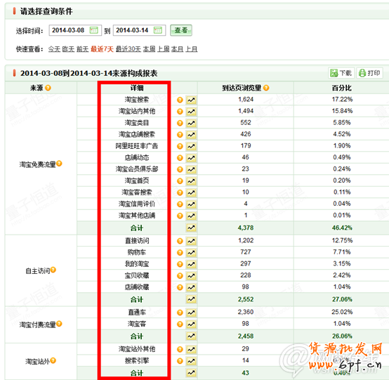 來源構(gòu)成中總結(jié)了店內(nèi)所有瀏覽的來源情況,比如某來源的到達頁瀏覽量及其所占的百分比。從中可以看到我們直通車推廣的流量占比,開車后自然流量是否有提升