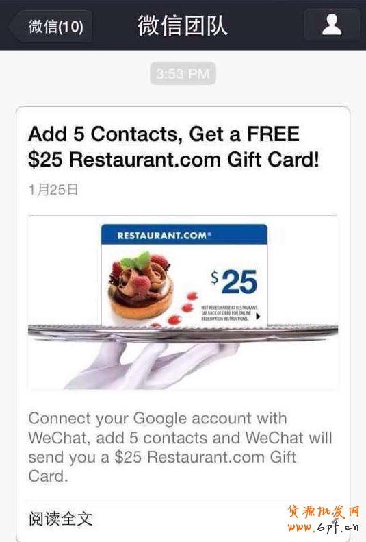 微信海外版wechat向美國(guó)用戶推送一條信息:只要在微信連接谷歌帳號(hào),同時(shí)邀請(qǐng)五位聯(lián)系人,wechat將送你一張25美元的餐券。