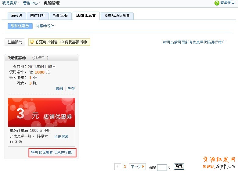 設置成功后,商家們會看到這樣的后臺,在每一份優惠券右下角,有“拷貝此優惠券代碼進行推廣”的入口,商家朋友們可以拷貝代碼講優惠券放到店鋪中醒目位置供買家點擊領取