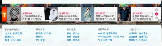 目前新浪微博針對中小型賣家推廣的產品有頁面底端“從淘開始”的商品推薦框和右側的“熱門商品推薦”,點擊后即直接跳轉至一淘購物頁面。