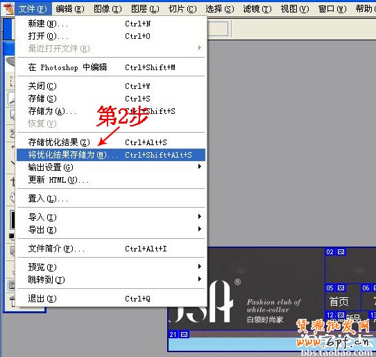 在ImageReady打開切片的背景圖片后,點擊”文件->-“將優化結果存儲為(m)。