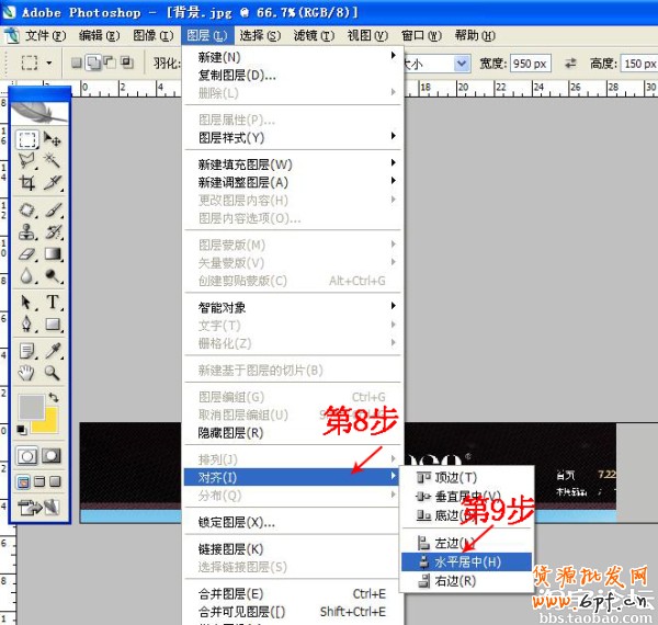 點擊菜單欄上的”圖層“->”對齊“->”水平居中“。這樣可以正確截取背景圖片中店招的內容。