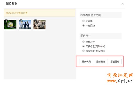 把鼠標移動至想要復制的圖片上,就會顯示出3個復制圖片的快捷按鈕。依次功能為“復制圖片、復制鏈接、復制代碼”,如下圖。賣家只需要選擇對應的復制功能,就可完成復制圖片的工作。