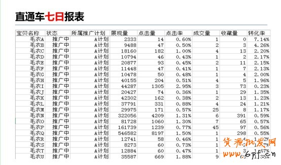 當掌柜確定了這四個數據維度,就可以從店鋪的直通車后臺按這些數據維度,下載我們需要的數據報表。在時間上,掌柜最好選擇下載七日的報表,因為作為一款新品來說,7天的數據相比3天和30天更有時效性和準確性。原始報表下載以后,掌柜只需刪除無用的信息,只保留寶貝名稱、點擊率、成交量、收藏量和轉化率,但是為了方便大家更好理解和有一個全局直觀的認識,我保留了狀態、所屬推廣計劃、展現量、點擊量這些維度的數據。