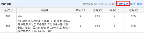 那么這時(shí)候我們?cè)趤?lái)修改一下這里面的一些參數(shù),前面我們數(shù)了一下地區(qū)有57個(gè)。當(dāng)然遠(yuǎn)遠(yuǎn)不只57個(gè),我們能看到的就大概57個(gè)左右。這時(shí)候我們就要建立57個(gè)運(yùn)費(fèi)模板,上面的方法我們復(fù)制了一個(gè)模板。同樣的方法 我們要復(fù)制大概一共57個(gè)模板。然后進(jìn)行修改,修改的時(shí)候大家注意下細(xì)節(jié)