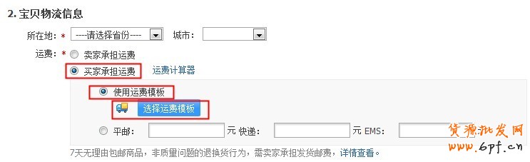 1)寶貝發(fā)布頁面,選擇“買家承擔(dān)運費”-“使用運費模板”-“選擇運費模板”: