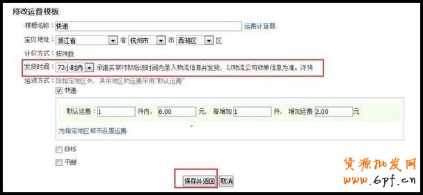 2) 在“發(fā)貨時間”選項合理設(shè)置發(fā)貨時間后,點擊“保存并返回”發(fā)貨時間設(shè)置即可啟用