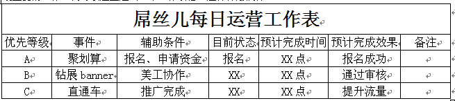 舉個(gè)例子來說,比如我今天的工作是做鉆展圖片丶直通車推廣丶報(bào)名聚劃算活動(dòng),這三項(xiàng)是最重要的工作。我可以建立這么一個(gè)工作表格,進(jìn)行計(jì)劃執(zhí)行。
