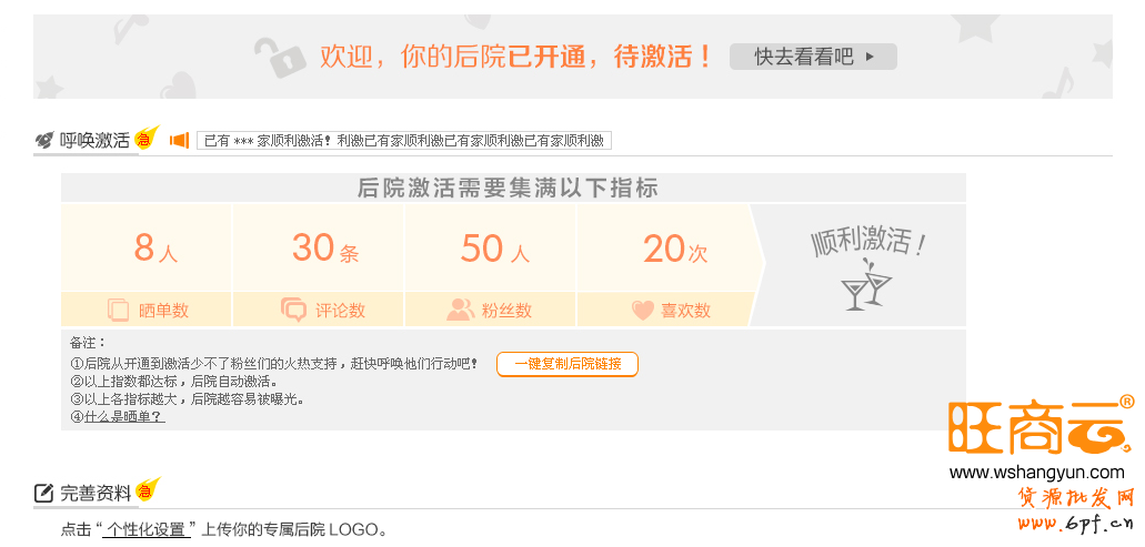 后院的激活標準:8個曬單+20個喜歡+30個評論+50個粉絲 只要達到這個激活標準,后院將自動被激活,前臺將變為激活后的頁面。官方還會出后院風云榜,最熱門的后院/最新激活的后院都會被展示。