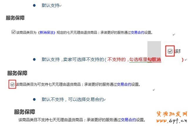 2、 默認支持”七天退貨”服務的商品品類,賣家可根據實際情況選擇不支持”七天退貨“的十一大類,淘寶將在商品發布頁面,開放設置入口.