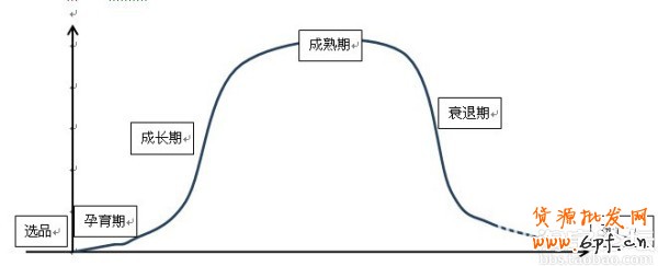 橫軸代表時(shí)間,縱軸代表寶貝的交易量,從上圖可以很清晰的看出一個(gè)成功爆款必然要經(jīng)歷緩慢的原始銷量累積的孕育期,銷量急速上升的成長(zhǎng)期,銷量大且穩(wěn)定的成熟期,成交量持續(xù)下降的衰退期;加上開始的選品和最后宣判死亡就是一個(gè)完整的寶貝生命周期。
