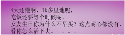 買家評價:比蝸牛還慢,什么物流,耽誤了我給女友過生日,女友生氣了,差點跟我分手,我倒霉透頂,給你差評!