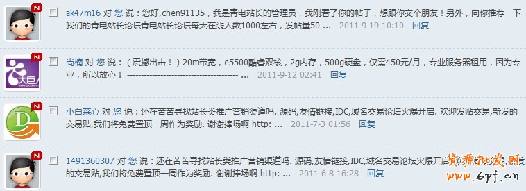 的確,這樣其實也是一種很好的描述自身的方式,因為在一個論壇之中,我們往往需要推銷自己,我們需要做自己的業(yè)務,記得以前知道藍冰互聯(lián)的時候,也是通過論壇看到他們的帖子,然后知道他們的網(wǎng)站,最后再去看一下他們的評價,最終確認了他們的服務還不錯的觀點,其實很多時候,一條短消息是一個營銷的門道,在很多時候,我們都會想到那些硬推廣,卻不屑于使用這些小的推廣模式;其實如果一個論壇可以保證相關性的話,這樣一點可以很值得讓我們用到,而且在個人空間里留言,也是一種外鏈的制作方式,如圖: