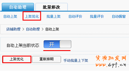 2.在“自動助理”里能很快的就找到“上架優(yōu)化”,這也是我想要強(qiáng)調(diào)的一個功能。里面的“重新排期”即為 批量上架計劃 的制定頁面(下文步驟4我會提及到,剛使用勝券店長的掌柜 可以先進(jìn)行上架計劃制定,之后,在進(jìn)行上架優(yōu)化。)