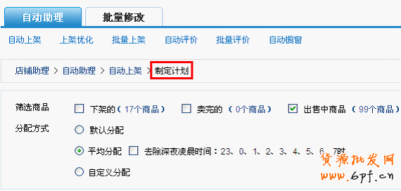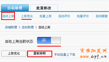 4.如果掌柜對自己的上架計劃不滿意,想重新進(jìn)行設(shè)置,可點(diǎn)擊“重新排期”(上圖),或者通過點(diǎn)擊“自動助理”欄的自動上架→重新排期 進(jìn)入(下圖)。這個功能能幫助掌柜重新設(shè)置寶貝上架時間。