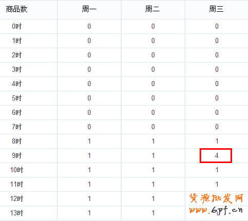 數(shù)字4即表示在周三9點(diǎn)會有四件商品上架。將鼠標(biāo)移到4的上方: